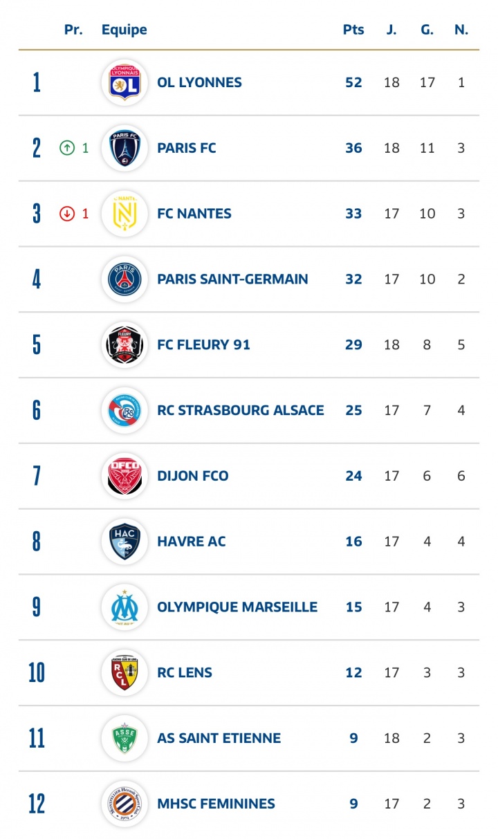 女足法甲有12支球队,目前进行到第18轮,蒙彼利埃女足本轮未赛暂垫底,已赛17场2胜3平12负积9分,本轮她们将战积分榜第二的巴黎女足。